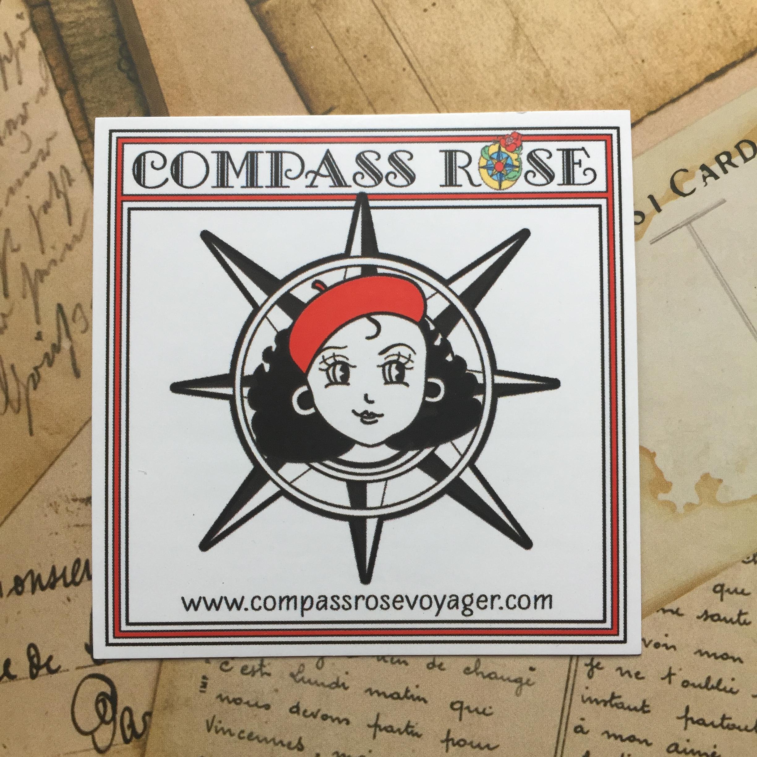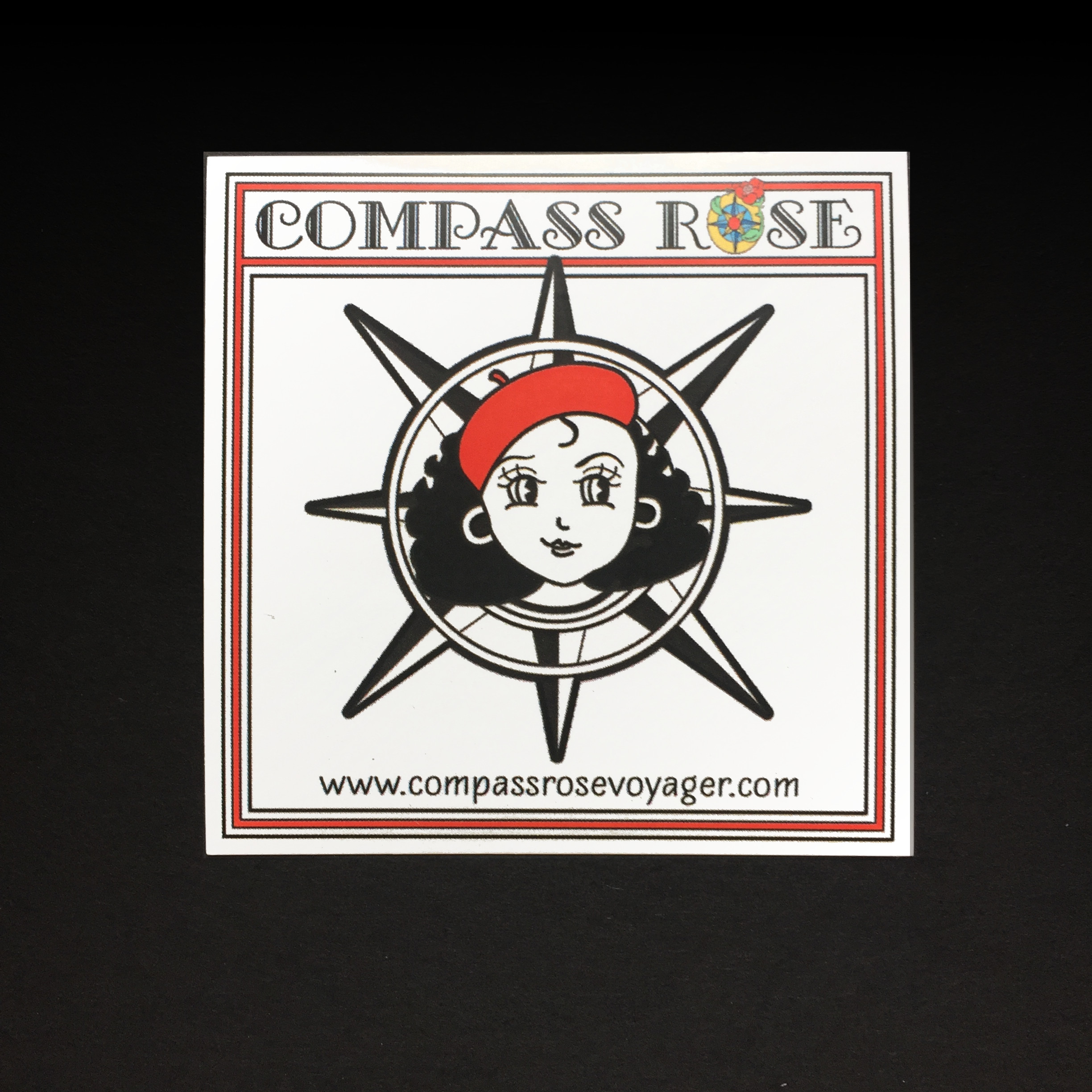 Two charming Compass Rose Voyager logo stickers to decorate books, binders, gift cards and more! In Compass Rose signature white, black and red. Each sticker is 3" x 3"