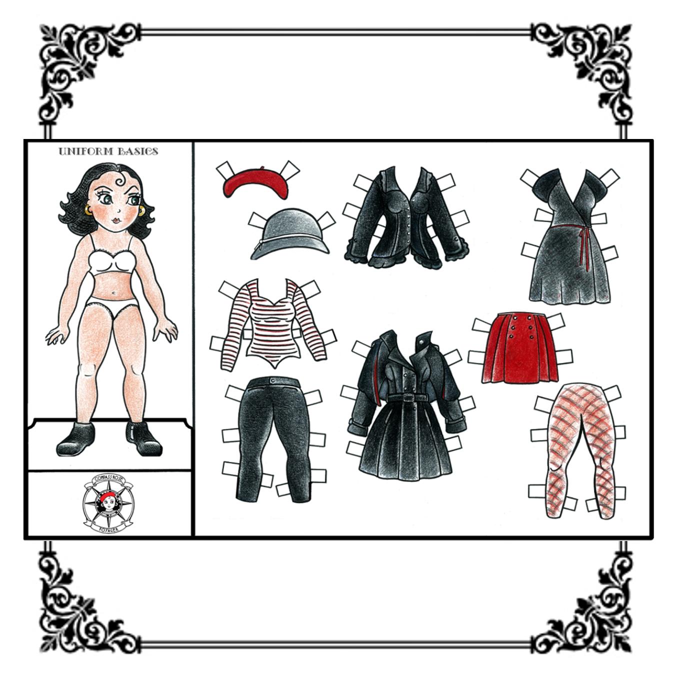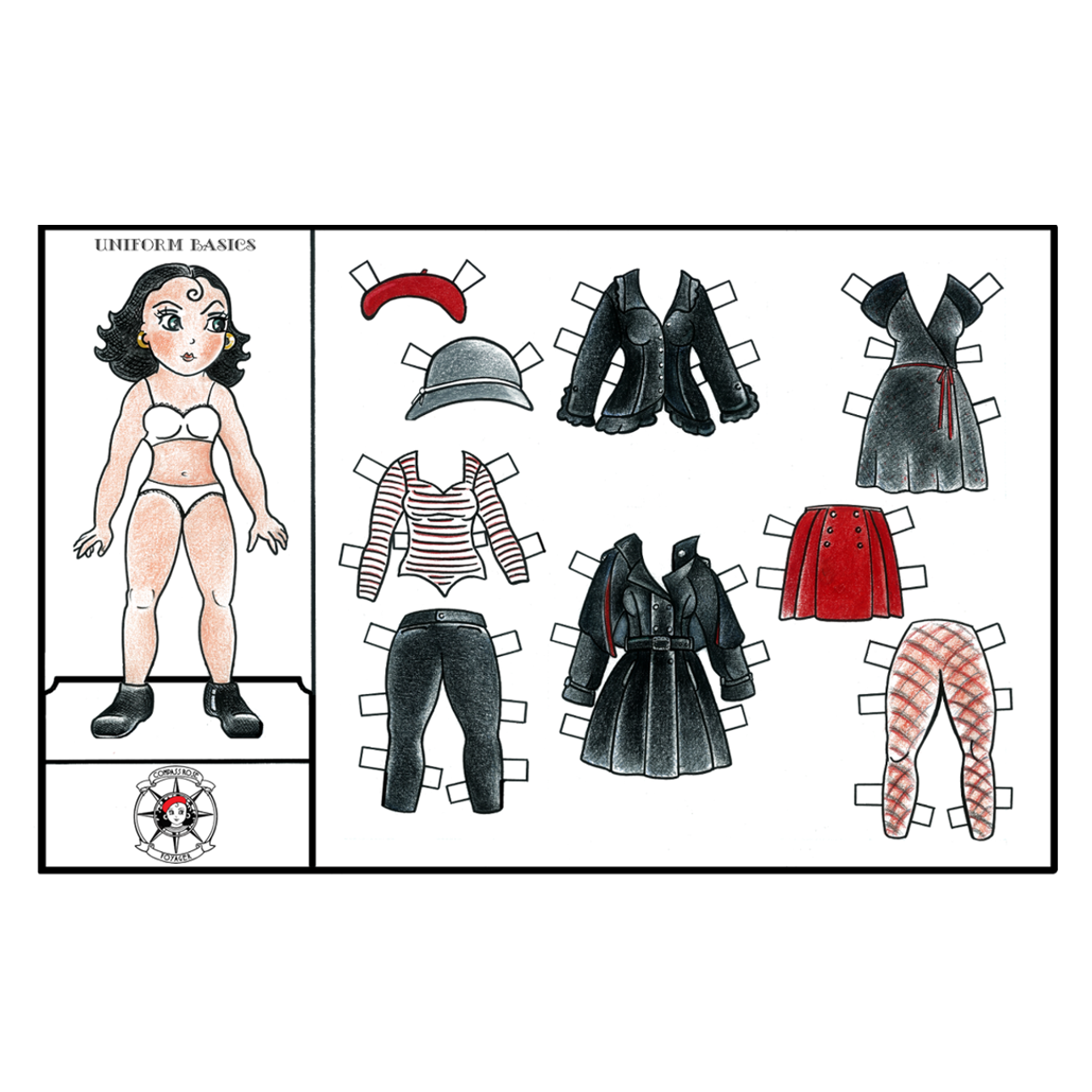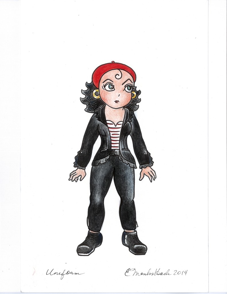 The outfits of intrepid Compass Rose are journey appropriate! Here is the original concept uniform. A striped T-shirt, indestructible pants and booties, a red beret.